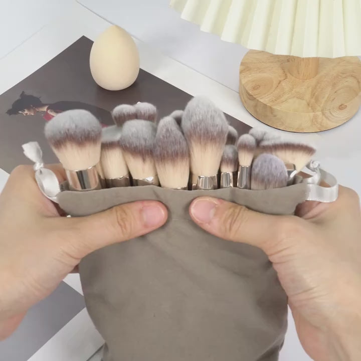 Met 18 professionele brushes, een grote make-up spons in waterdruppelvorm en een flanellen opbergzak ben je klaar om te stralen – thuis én onderweg.